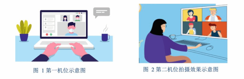 (二)考生需要准备可以支撑“双机位”运行的硬件,即需要两部带摄像头的设备及附件,包括电脑、手机、手机支架等。两个机位设备即电脑和手机摄像头像素不低于标清720P(720*1280)。面试时,1台笔记本电脑或台式机或手机(具备音、视频输入、输出功能),用于面试设备,作为主机位。1部手机或笔记本电脑或台式机或PAD等平板设备(须带有摄像头),用于监控面试环境的设备,作为辅机位。设备具体摆放要求如下: