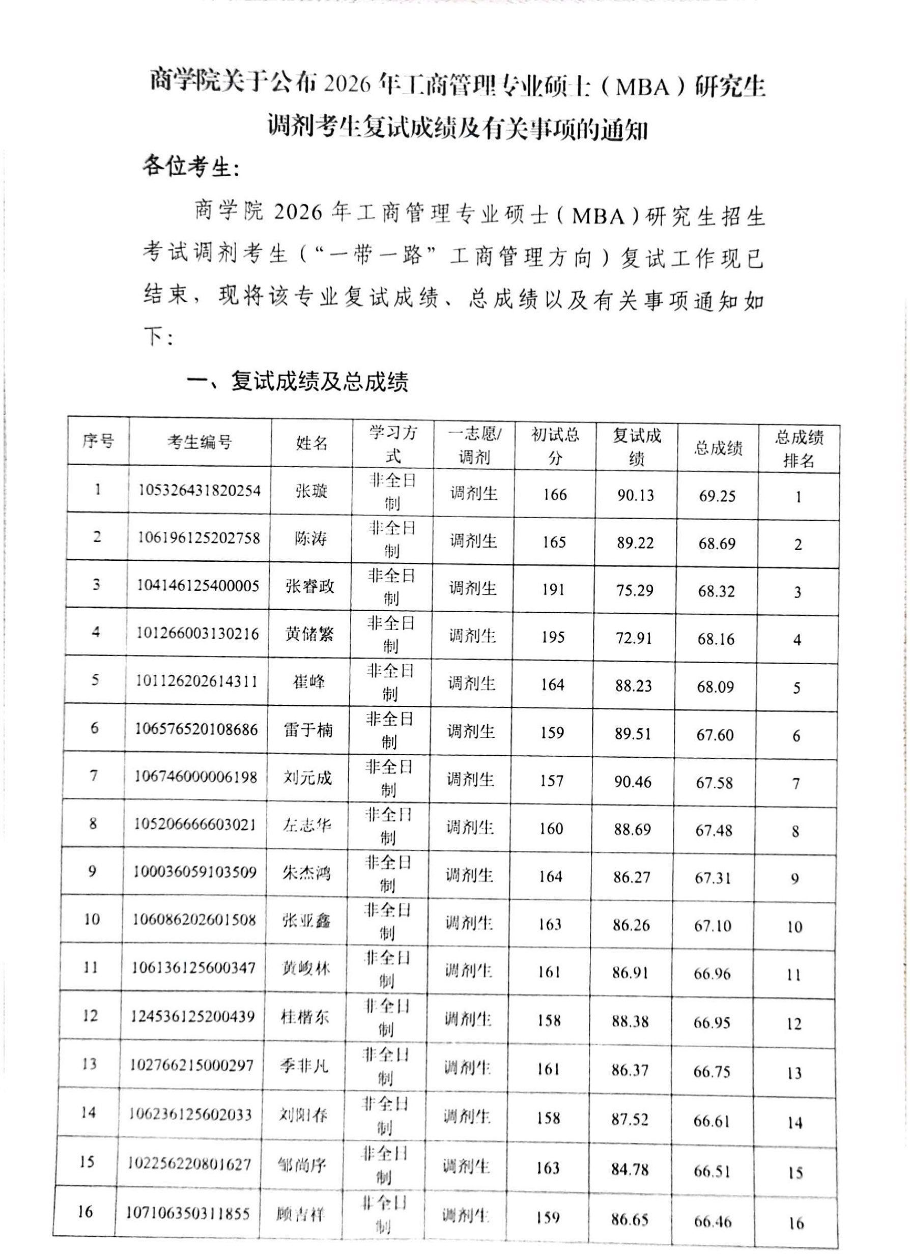 商学院关于公布2026年工商管理专业硕士(MBA)研究生调剂考生复试成绩及有关事项的通知