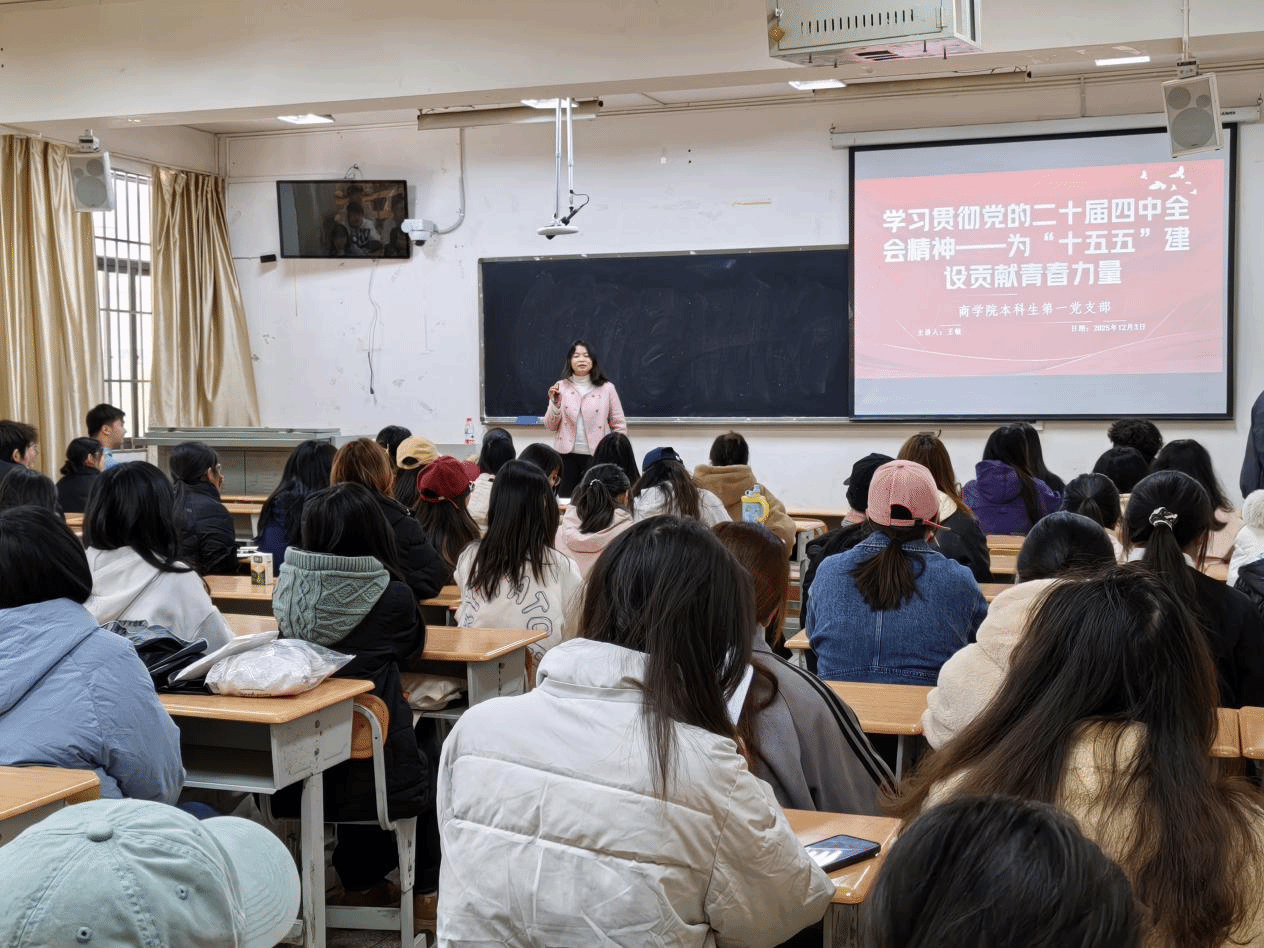 为深入学习贯彻党的二十届四中全会精神,引导学生党员深刻领会国家发展蓝图,明确时代责任与个人发展方向,12月3日,商学院党委书记王敏在卓远楼202教室讲授题为“学习贯彻党的二十届四中全会精神——为‘十五五’建设贡献青春力量”专题党课。商学院本科生第一党支部全体党员、入党积极分子参加学习。