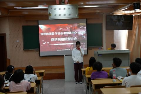 招新宣讲会在卓远楼阶梯教室开展。现场先播放暖场视频,展示各部门的工作成果与精神风貌。随后,商学院文体部带来舞蹈表演,为宣讲会营造热烈氛围。宣讲环节中,主持人对学院学生组织整体架构进行介绍,实践创新部、人力资源部、社团部等部门负责人依次上台,阐述部门职能与招新需求,使新生全面了解各部门特色。主持人吸引了三百多名大一新生进群了解。
