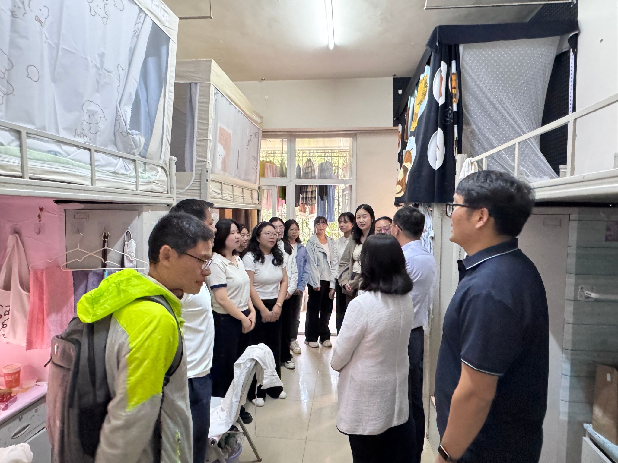 在走访过程中,王敏、杨增雄与新生亲切交谈,逐一询问大家的住宿安排、饮食适应情况,细致了解其入学后遇到的困难。学院领导共同查看了各宿舍的门窗闭合情况与消防设施完好度,随后询问同学们日常用电是否规范,着重提醒大家切勿使用大功率电器,及时拔掉闲置电源,避免安全隐患。并提醒同学们注意宿舍卫生,建议同学们制定轮值表,共同营造整洁舒适的居住环境,让宿舍始终保持干净有序。其他老师也针对教学管理流程、选课系统操作等实用问题,为新生进行现场解答,确保大家顺利开启大学阶段的学习。