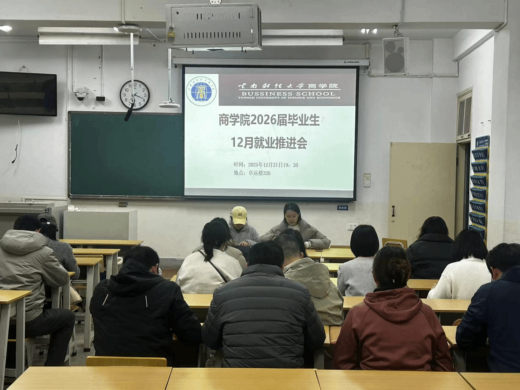为精准掌握毕业生就业动态,压实就业帮扶责任,全力推进2026届毕业生高质量就业,12月21日,商学院在北院卓远楼326召开2026届毕业生12月就业推进会。会议由党委副书记饶篁主持,学生管理科副科长文欢、全体辅导员及2026届毕业班班主任参会。